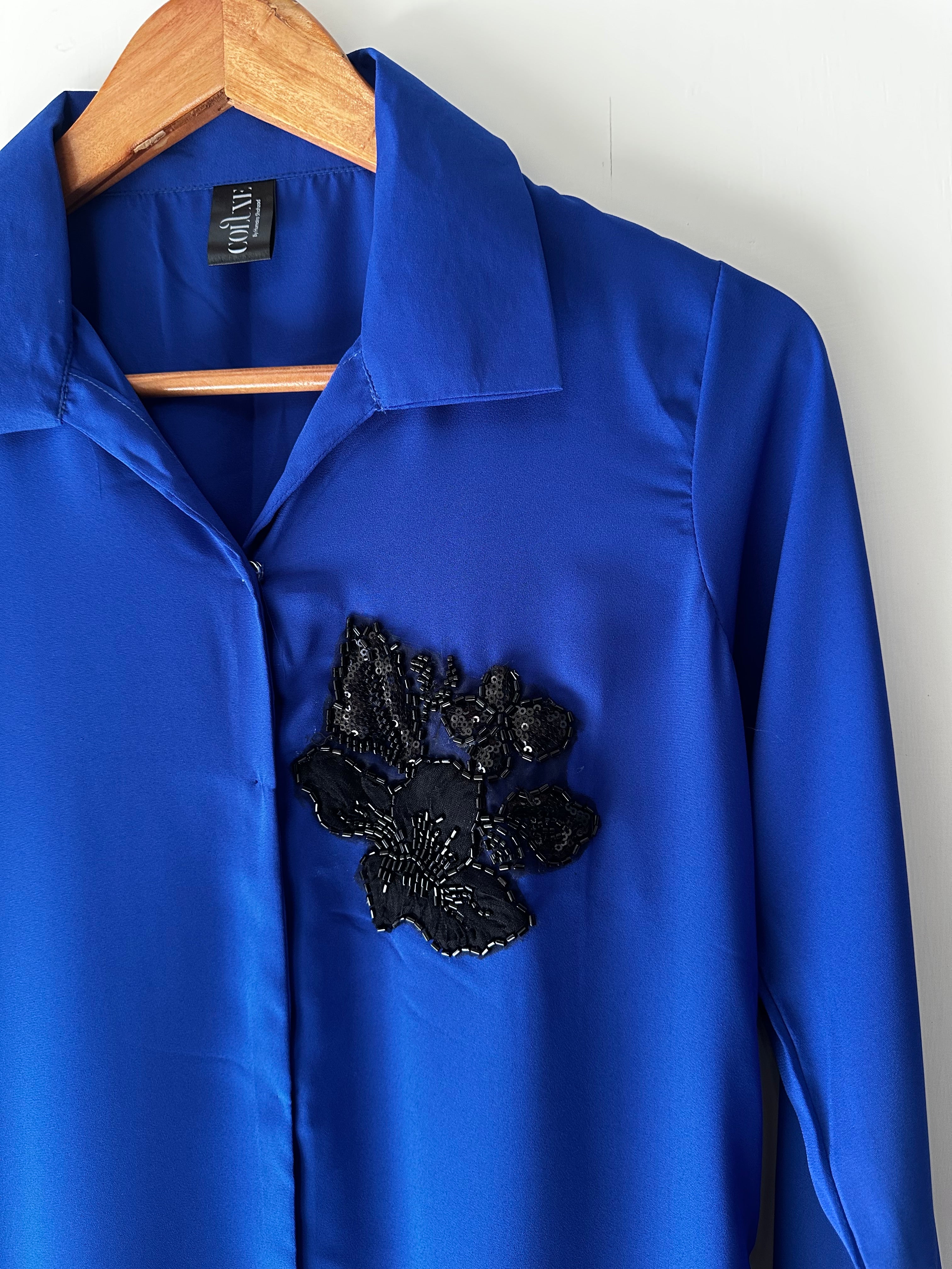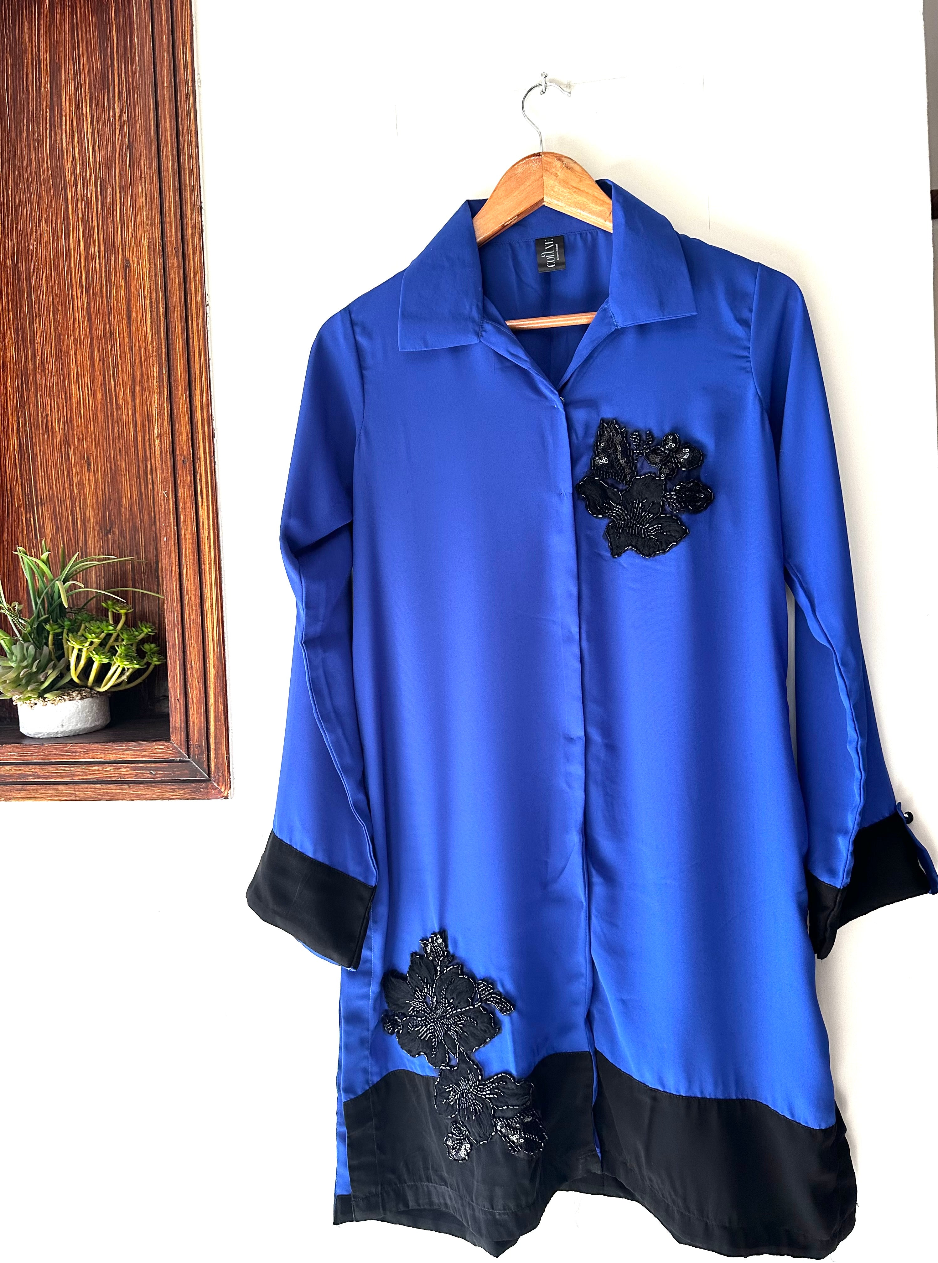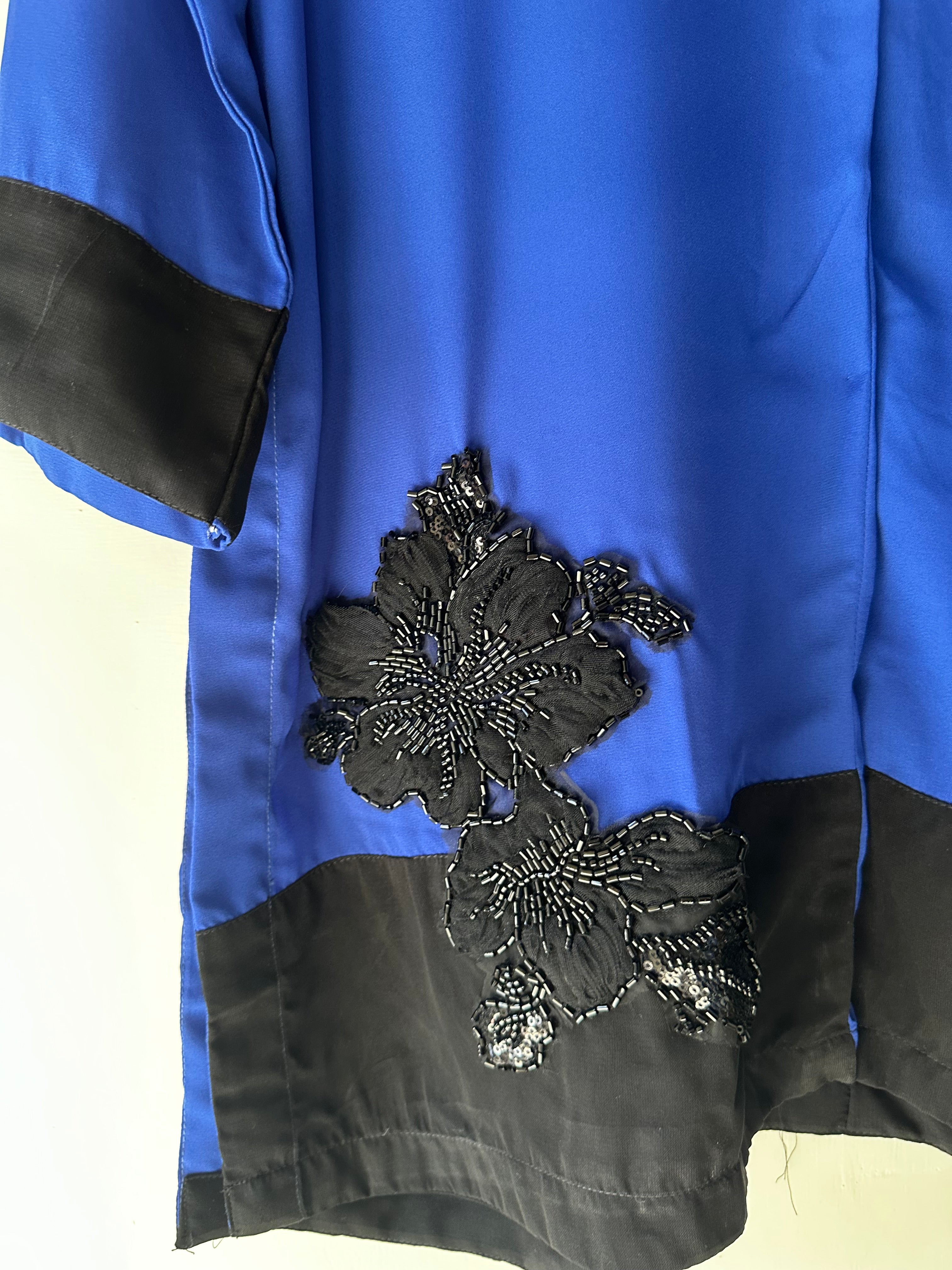 Two piece double georgette ink blue coord set with black detailing and beautifully stitched with perfection.