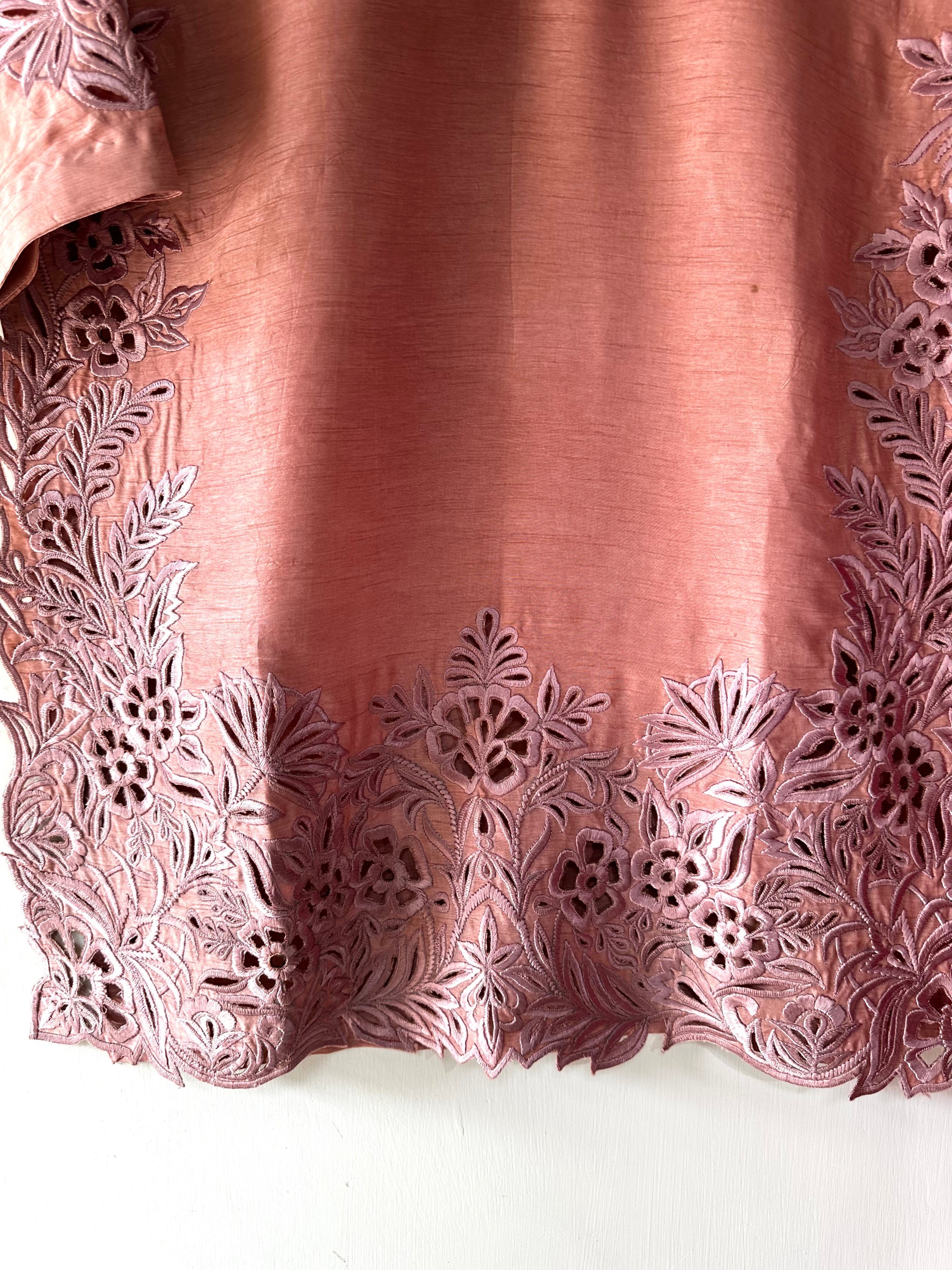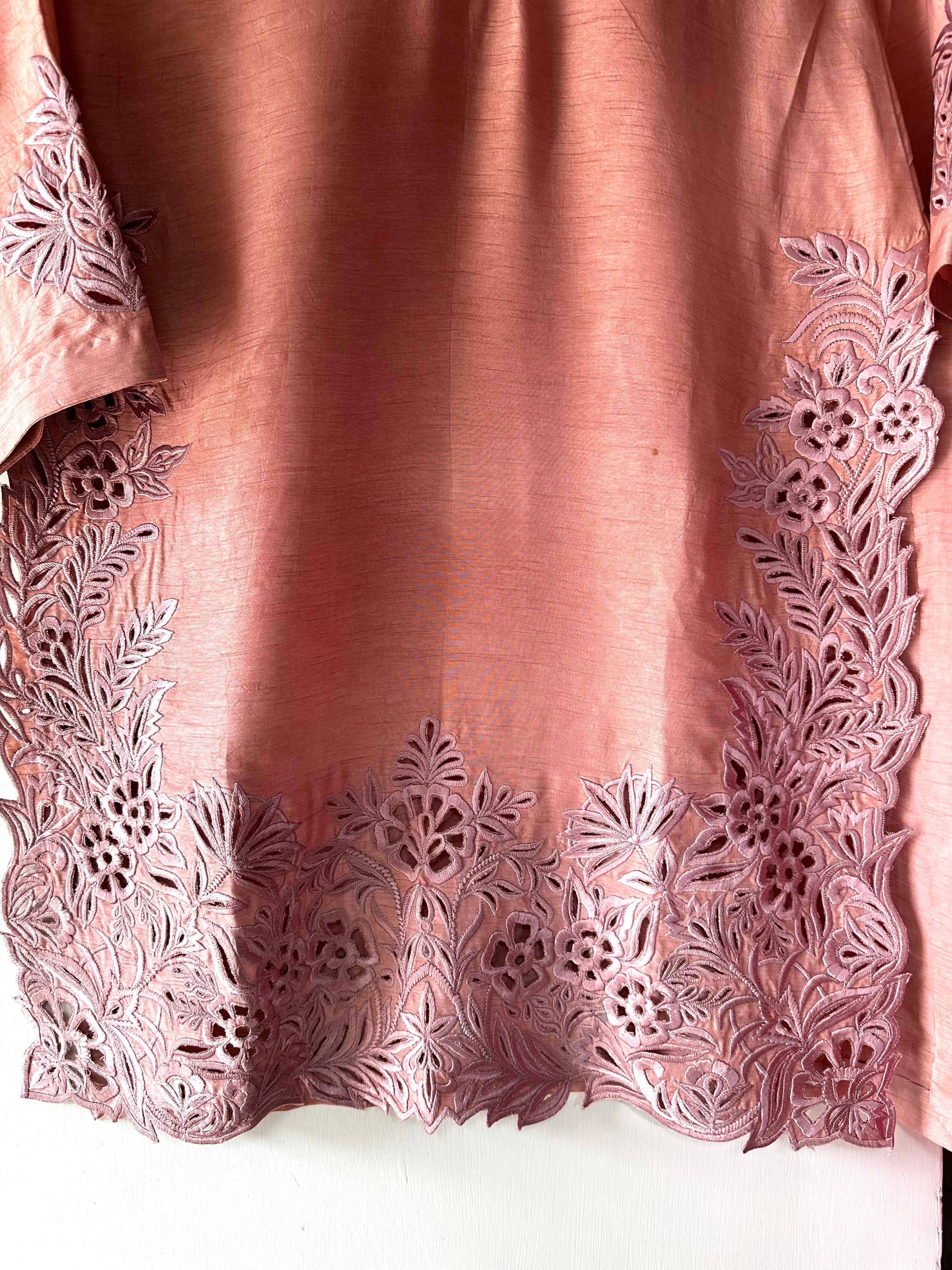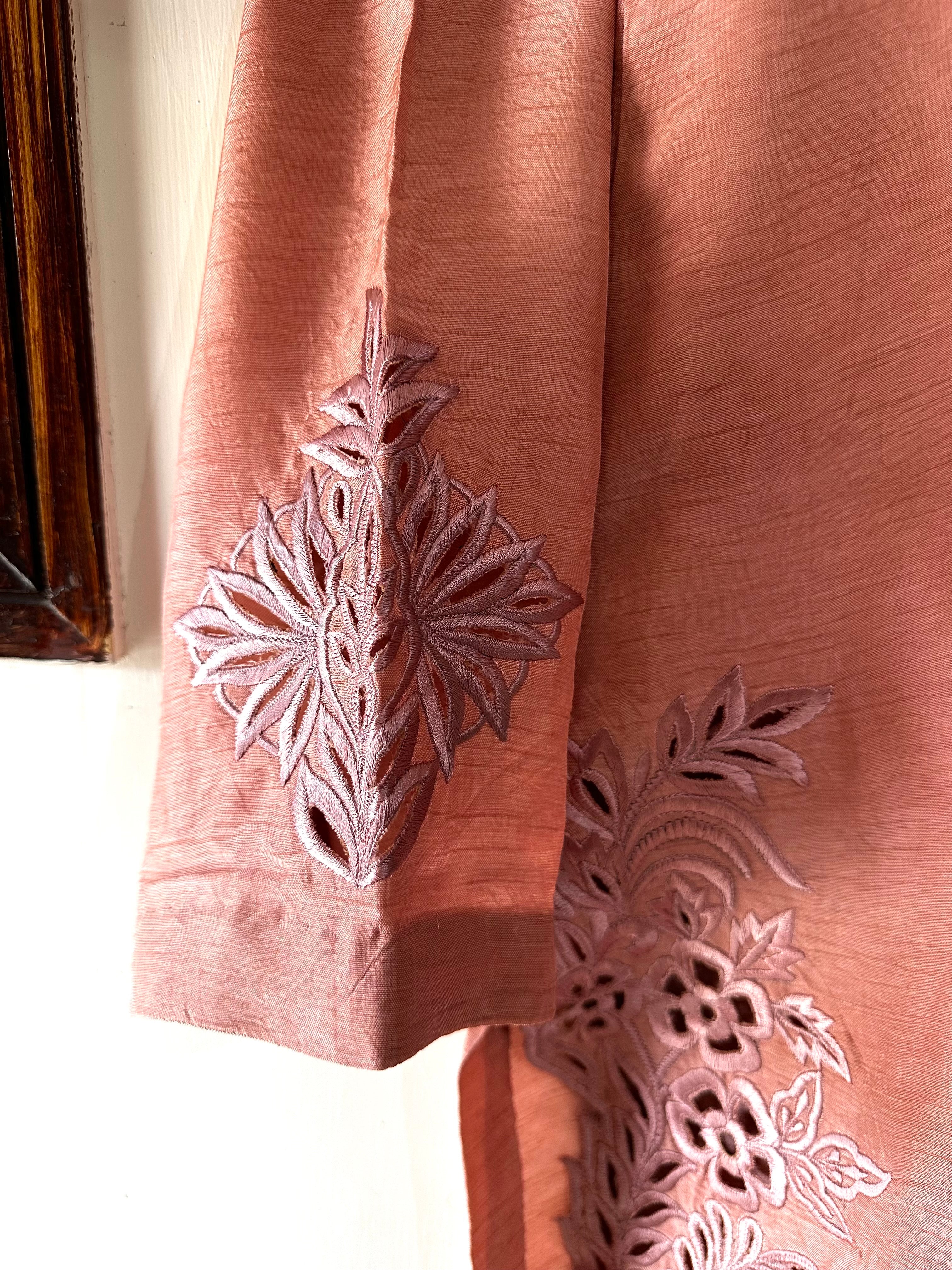 Three Piece tea pink colored sapphire silk formal wear with delicate embroidery details on daman and chak. Intricate motives are added on sleeves stylised with flawless stitching. This article is paired with scalloped organza dupatta enhancing the beauty of this dress. Perfect wear for eid, festivities and formal events.