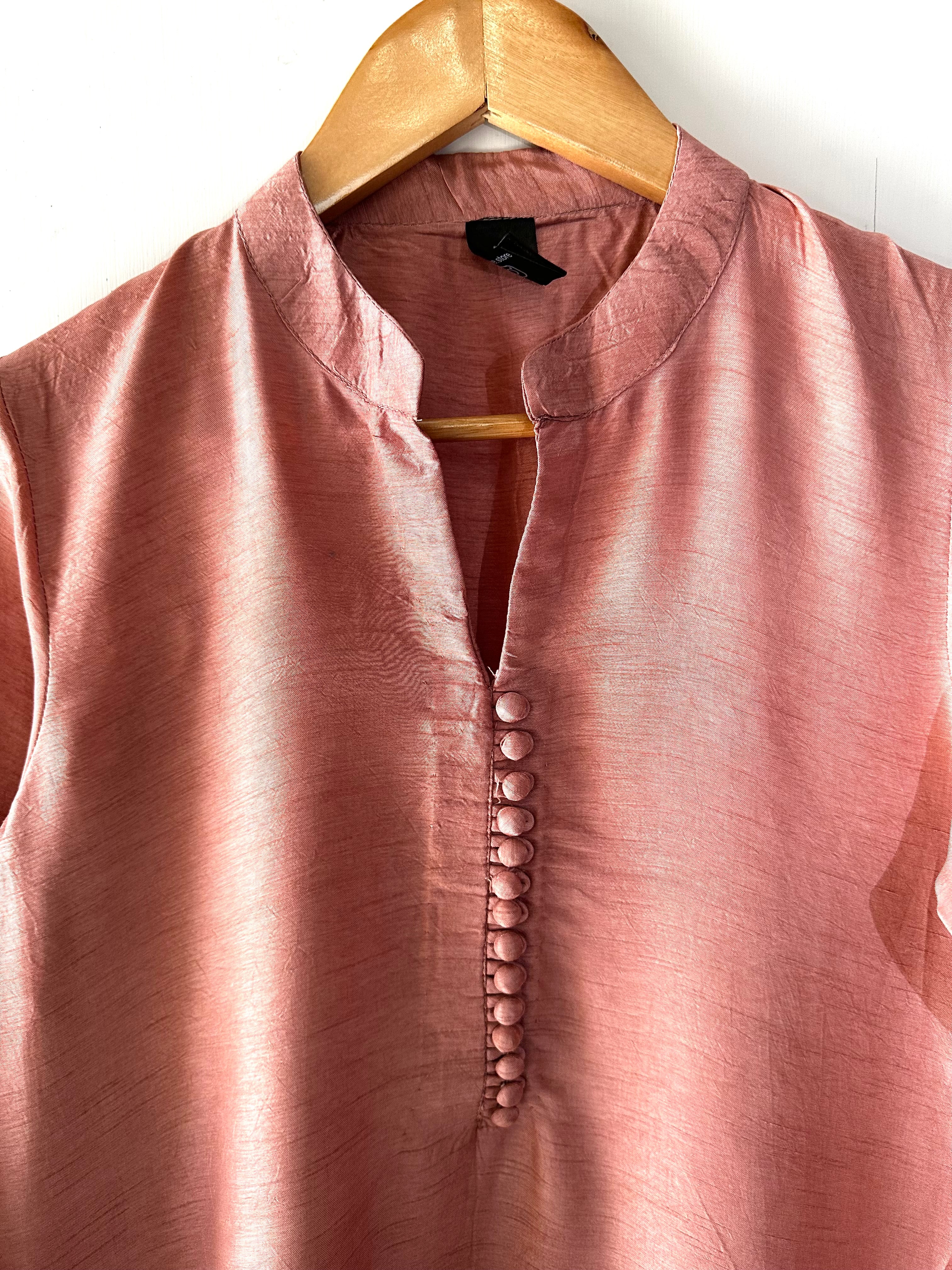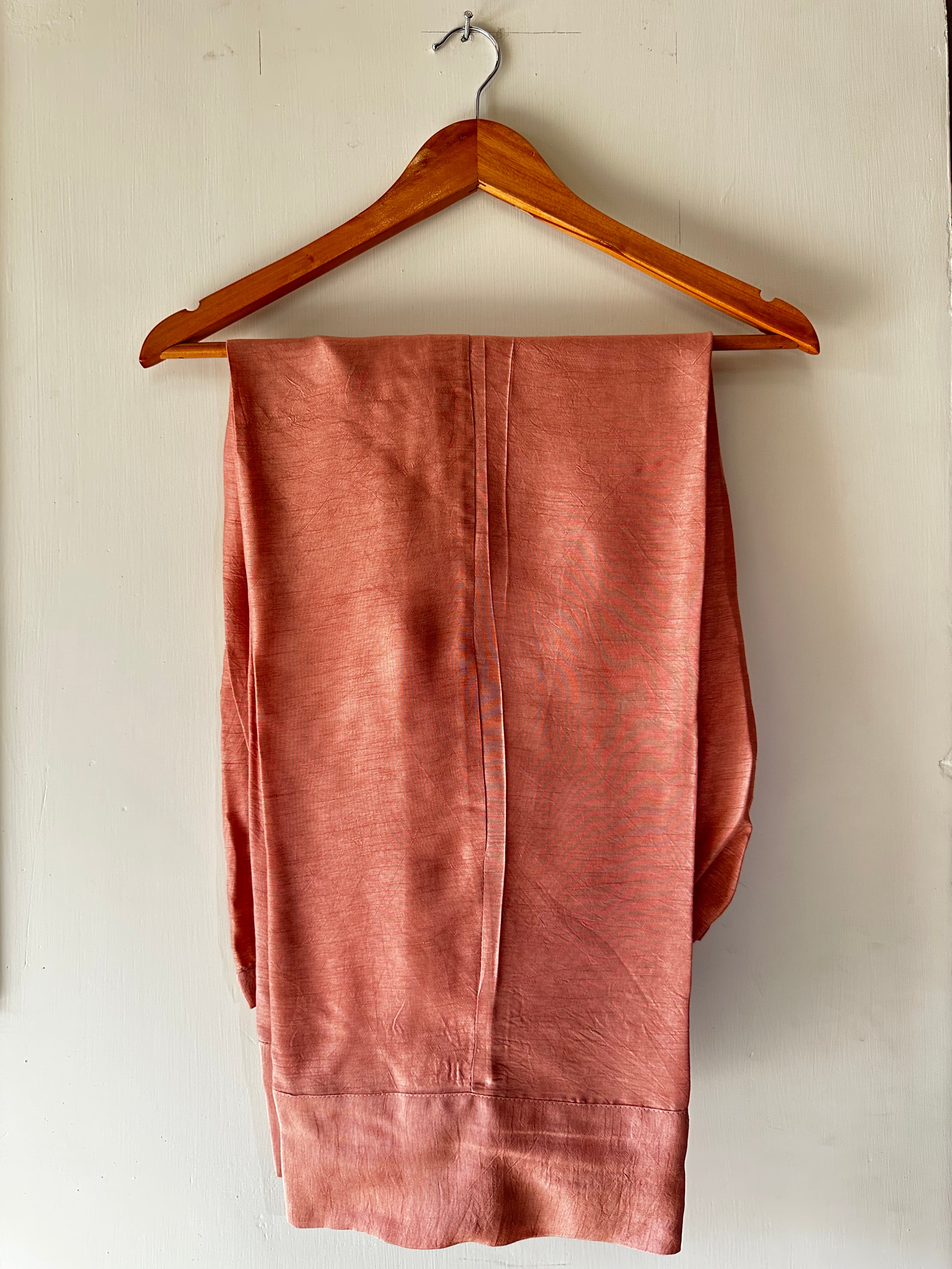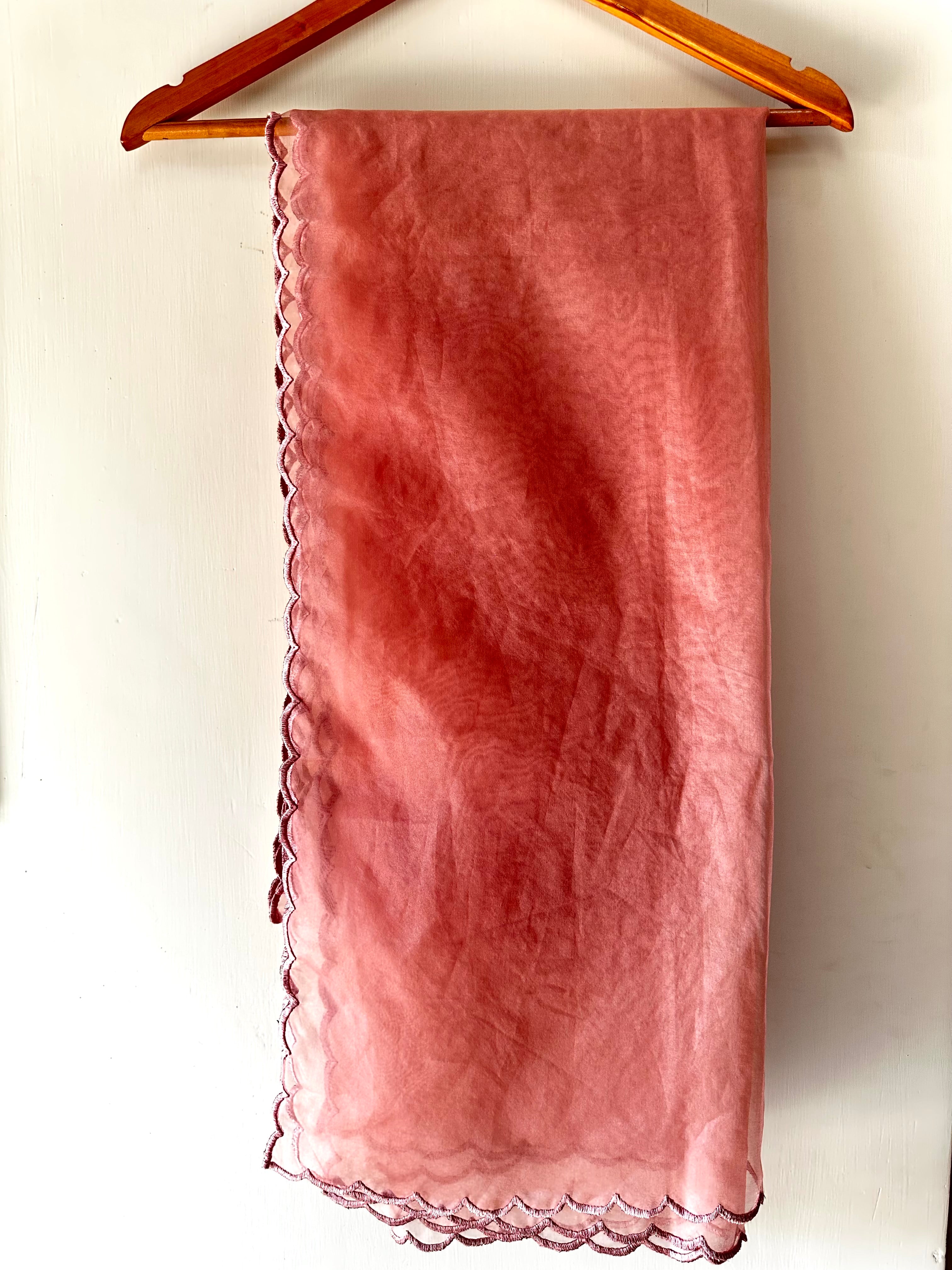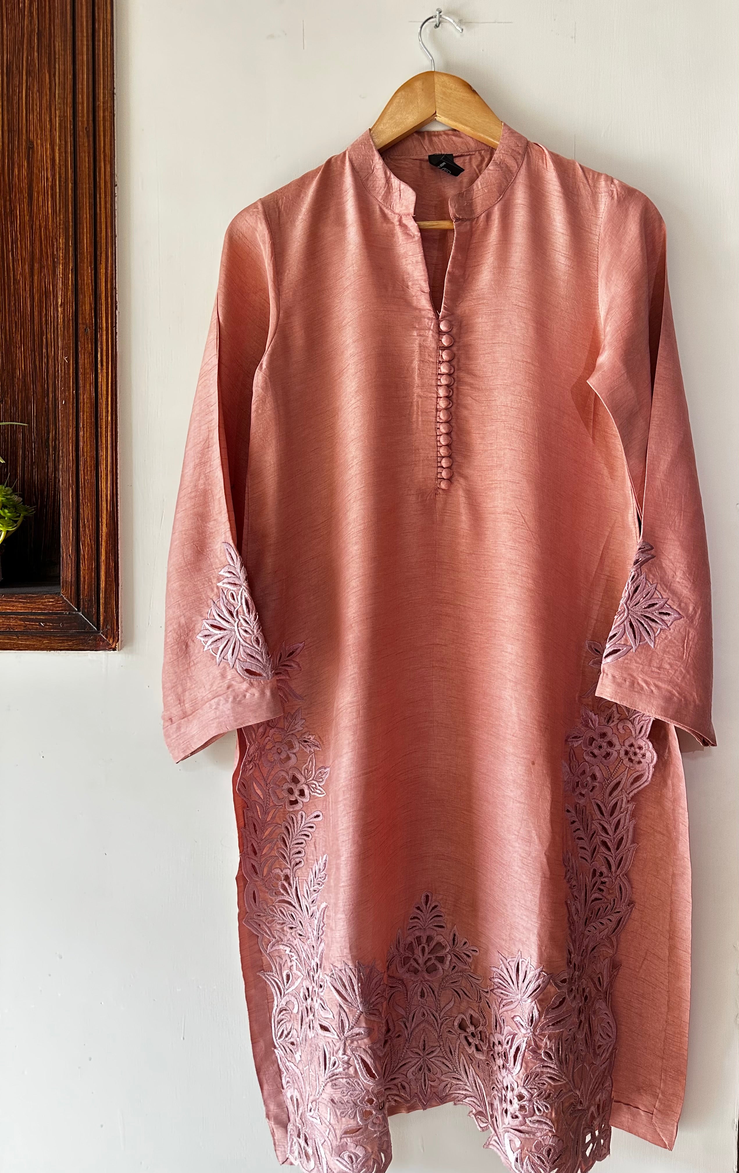 Three Piece tea pink colored sapphire silk formal wear with delicate embroidery details on daman and chak. Intricate motives are added on sleeves stylised with flawless stitching. This article is paired with scalloped organza dupatta enhancing the beauty of this dress. Perfect wear for eid, festivities and formal events.