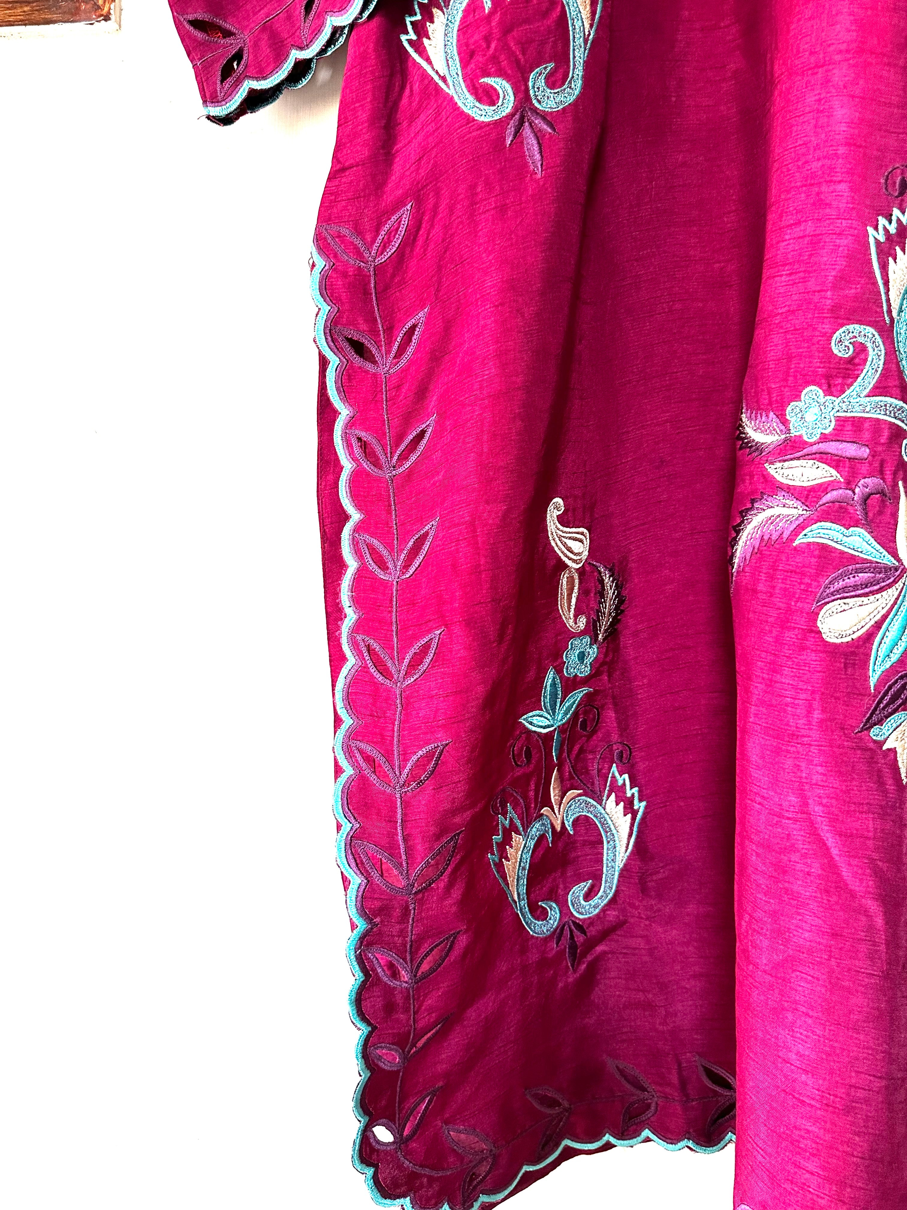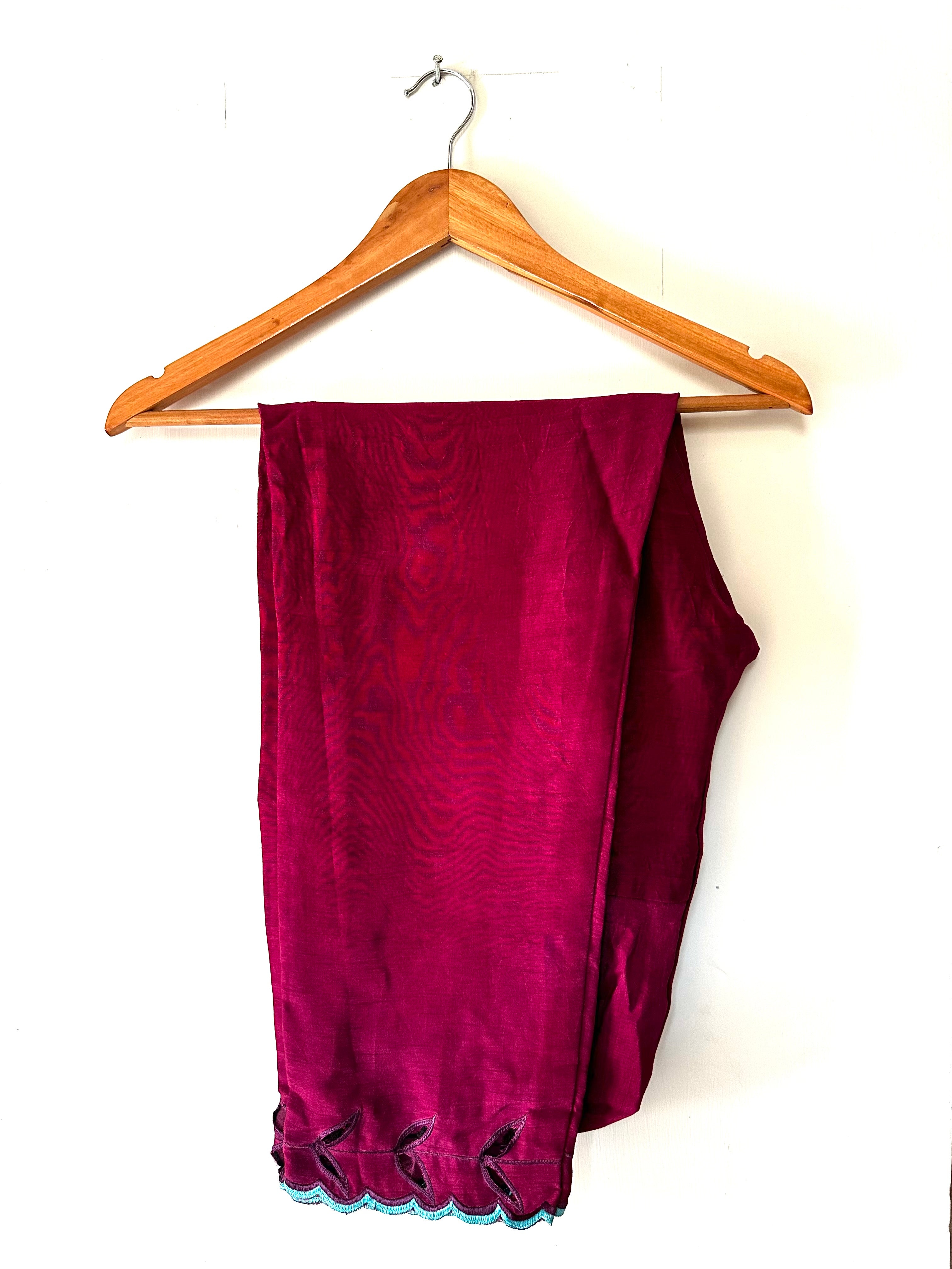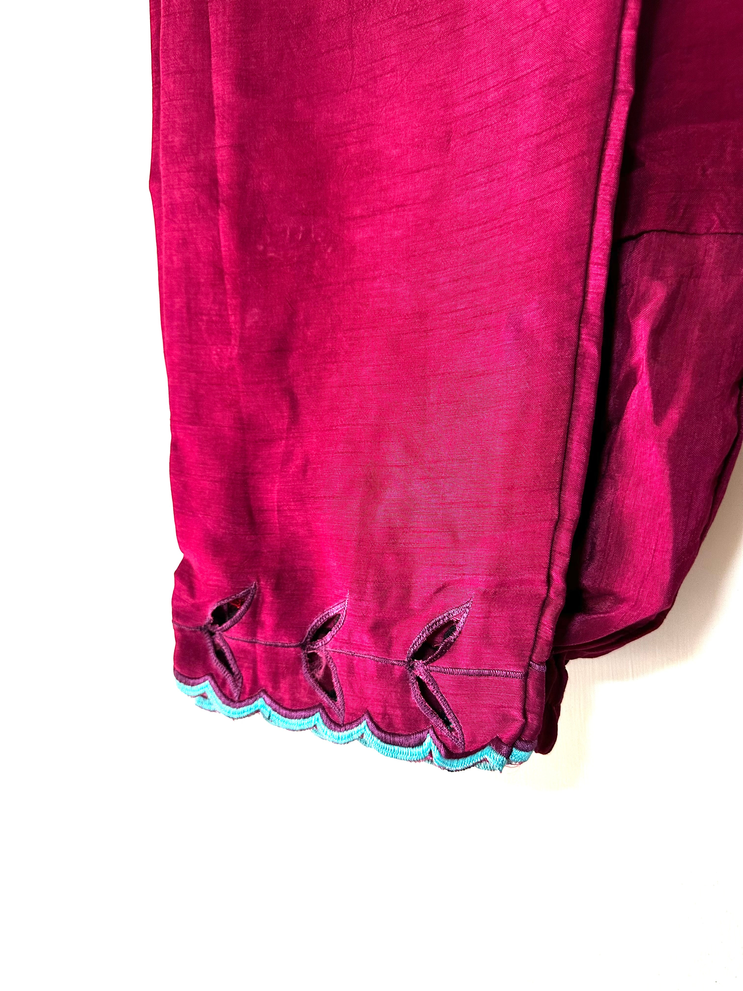 Two Piece plum colored sapphire silk suit with cutwork and embroidery.