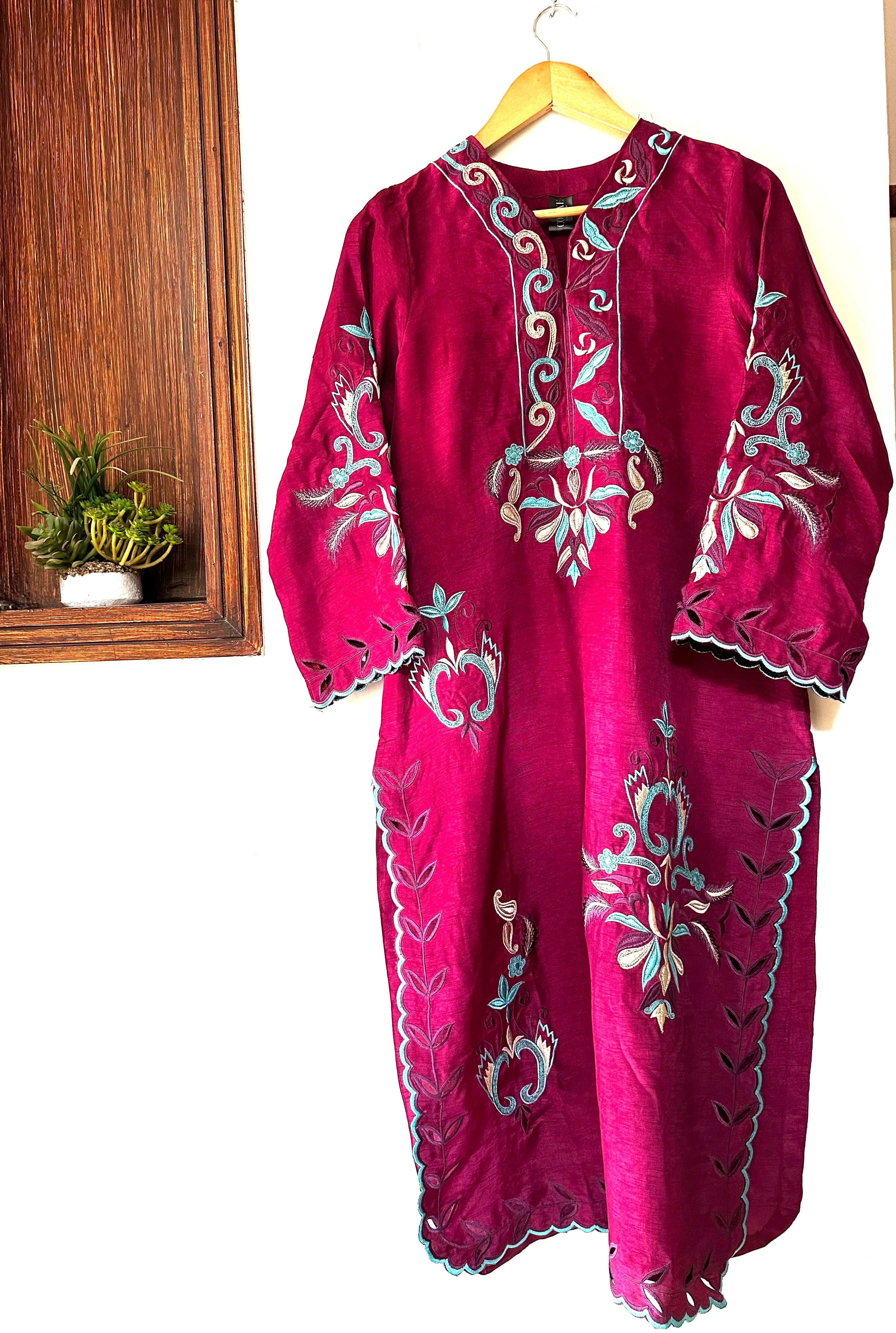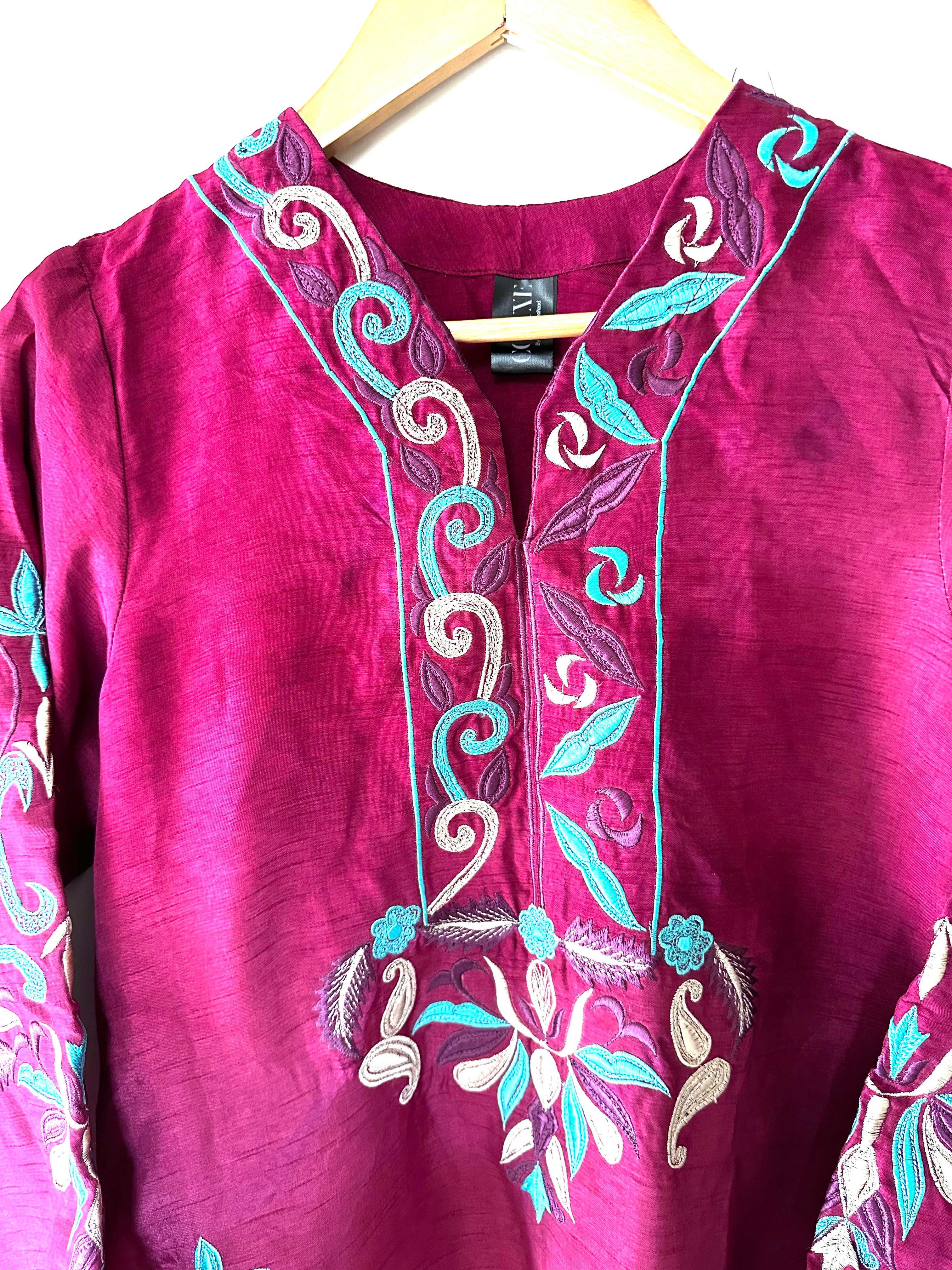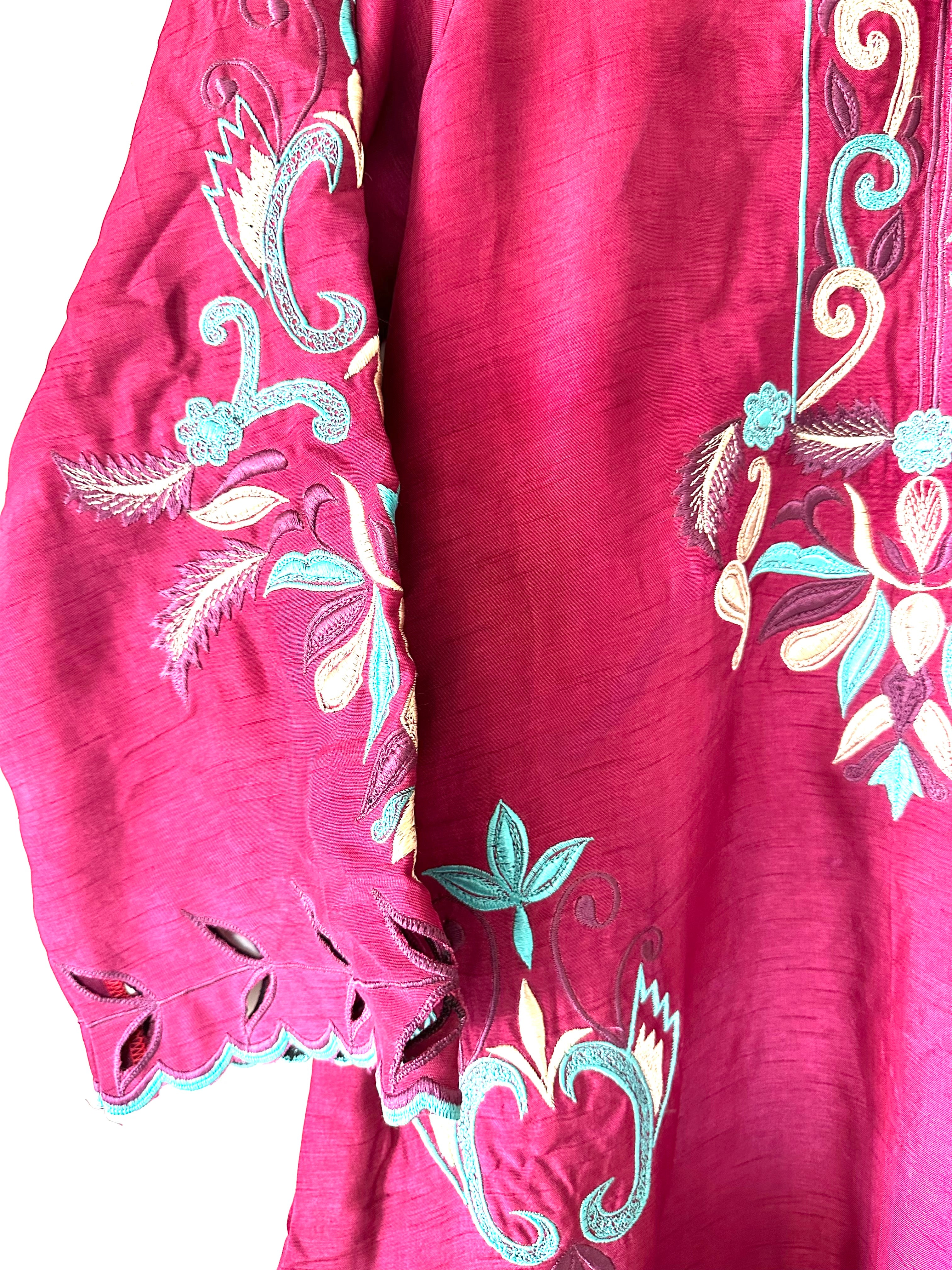Two Piece plum colored sapphire silk suit with cutwork and embroidery.